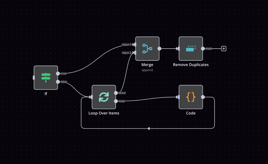 n8n以「節點」為核心,每個節點代表一個動作,例如接收資料、呼叫API、處理資訊,或發送 Email、Slack、LINE 訊息等,使用者只需將節點依邏輯串連即可建立流程。