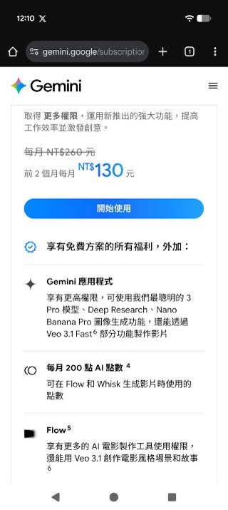 - 每月獲得 200 點 AI 點數在影片製作軟體 Flow 和 Whisk 創作高品質的影片。
