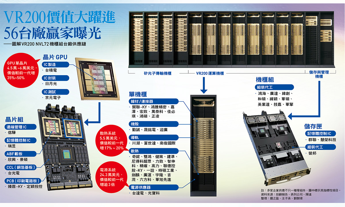一年半前,輝達首度推出 AI 伺服器機櫃 GB200 NVL72,實現的兆元銷售額,掀起供應鏈成長大浪,台積電、鴻海、廣達、緯穎/緯創、台達電等大廠,2025 年營收紛紛突破歷史紀錄!現在,新機種 VR200 機櫃亮麗現身,56 家台廠供應鏈全面搶進。