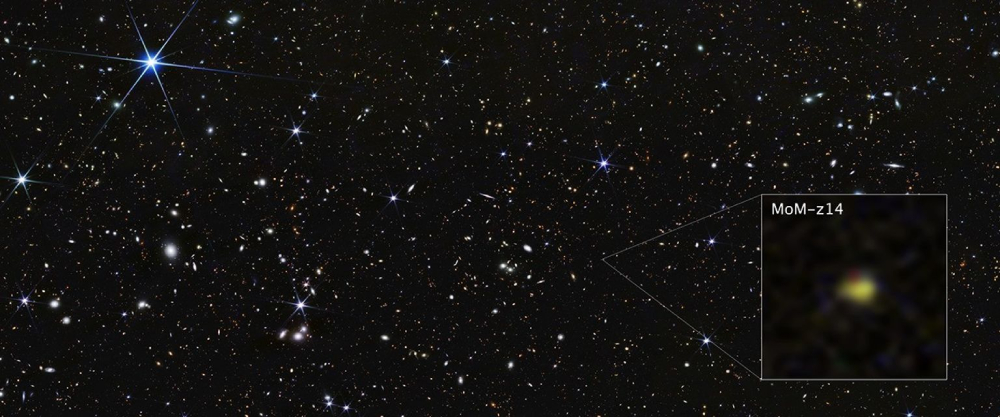 據研究團隊稱,MoM-z14是早期宇宙中的異常明亮的星系之一。隨著科技日新月異,這些異常明亮的星系被確認的數量不斷增長,比韋伯望遠鏡發射前理論研究預測的數量還要多出100倍,顯示關於早期宇宙的理論與觀測之間存在相當大的差距。
