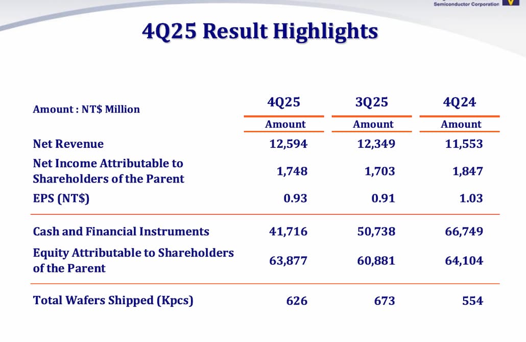 世界先進今(3 日)舉辦 2025 年第四季法說會,展望 2026 年第一季,預期晶圓出貨量將季增約 1% 3%;產品平均銷售單價將季減 3% 5% 之間;毛利率將介於 28% 30% 之間。