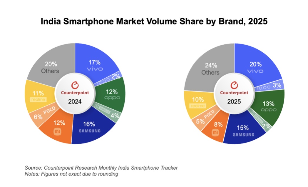 針對競爭態勢,Counterpoint Research 資深研究分析師 Prachir Singh 表示,vivo(不含 iQOO)以 20% 的出貨量市占率領先印度市場,採取橫跨大眾市場與高階市場的雙軌策略。其中 Y 與 T 系列帶動出貨量,而 vivo 以相機為核心的產品哲學,結合與 ZEISS 的合作以及新推出的 X200 FE,有效推動 X 系列出貨量年增 185%,並有效銜接 V 系列與旗艦 X 系列之間的產品定位。