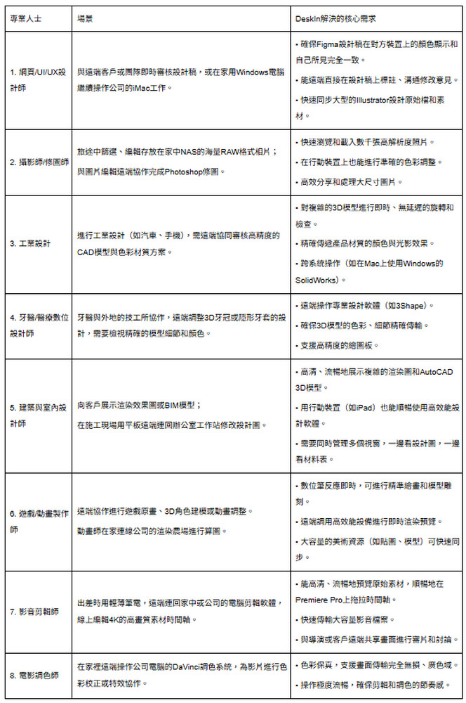 在全球化與數位化加速融合的時代,DeskIn不僅解決了創意工作者長久以來面臨的地理限制與技術斷層,更透過八大技術核心與真實場景的深度融合,將「遠距創作」從被動的替代方案,轉變為主動的生產力引擎。從設計師的即時色彩校正、影音團隊的分散式剪輯,到3D藝術家的雲端渲染與教育領域的互動教學,DeskIn已證明——創意不應受制於裝置性能、作業系統或地理距離。