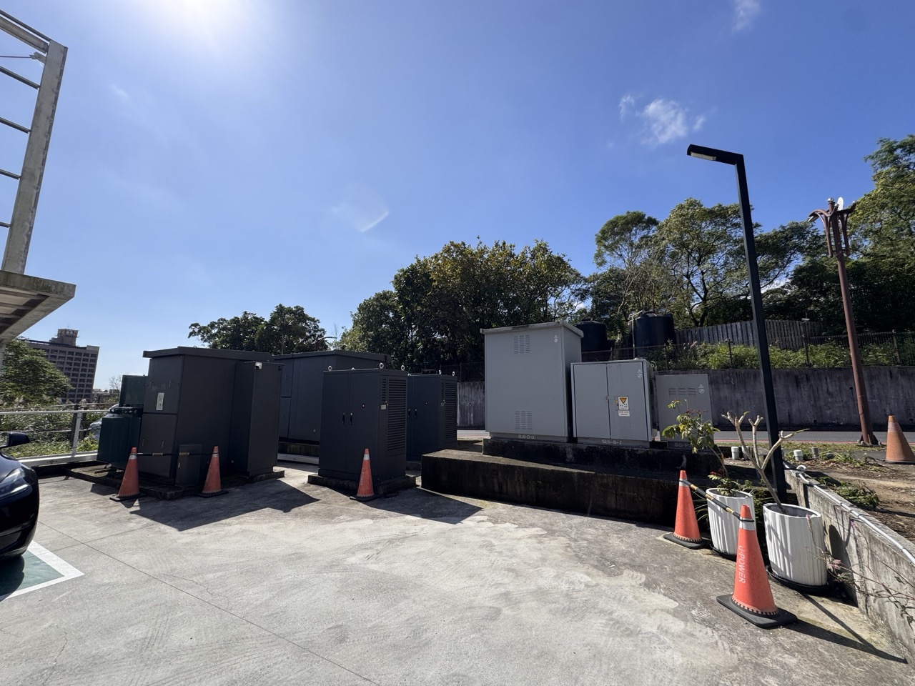 ▲ 藏在快充站角落的這些「箱子」,淺色的是台電設備,深色的就是「高壓配電設備」。(Source:科技新報攝)