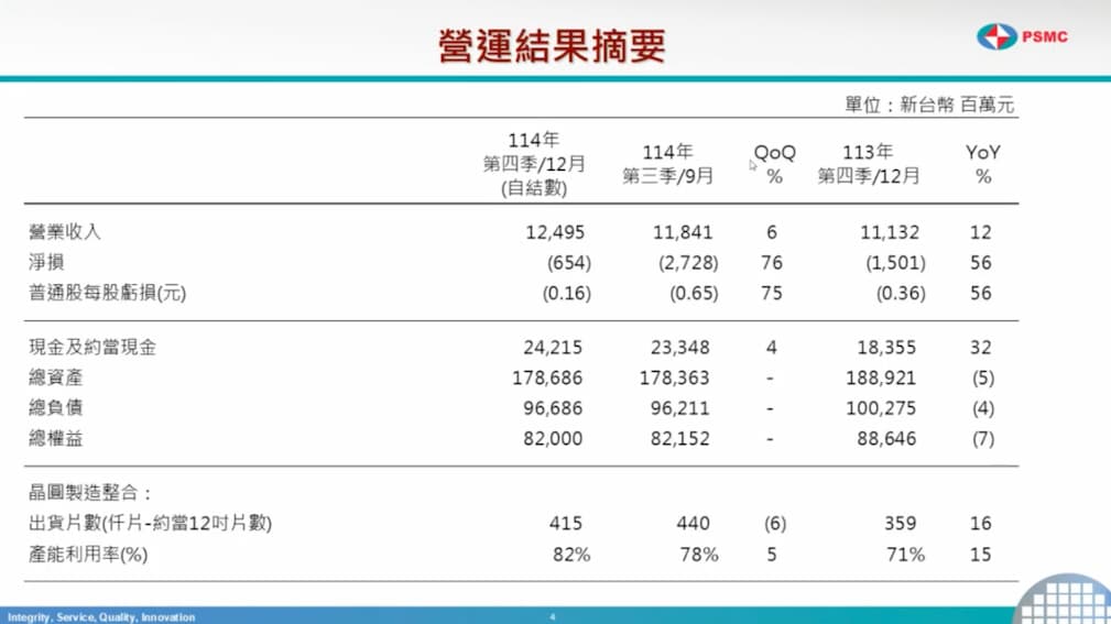 力積電 2025 年 Q4 營業收入新台幣 125 億,較 Q3 營收 118.4 億增加 6.6 億,美元營收則是增加 2%,主要是受惠於 DRAM ASP 上升及美元升值 4%之效益;毛利 7.9 億,主要是受惠於 DRAM ASP上升、美元升值及產能利用率提升;淨損 6.5億。
