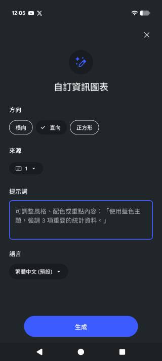 NotebookLM 手機版資訊圖表現在能夠自訂的項目包括: