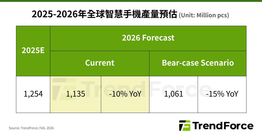 根據 TrendForce 最新智慧手機研究,2026 年全球手機生產表現受記憶體價格高漲影響,恐呈現 10% 的年衰退,總量約降至 11.35 億支。