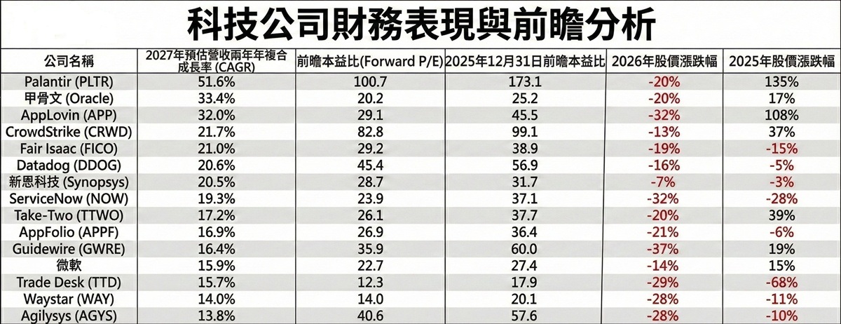 美國軟體股近來因 AI 競爭威脅股價直落,分析顯示,甲骨文(Oracle)、微軟(Microsoft)未來兩年營收有望飛快成長,股價目前已來到距吸引力的價位。相較之下,矽谷大數據分析商 Palantir Technologies Inc. 雖然未來的營收成長態勢極佳,但本益比依舊偏高。