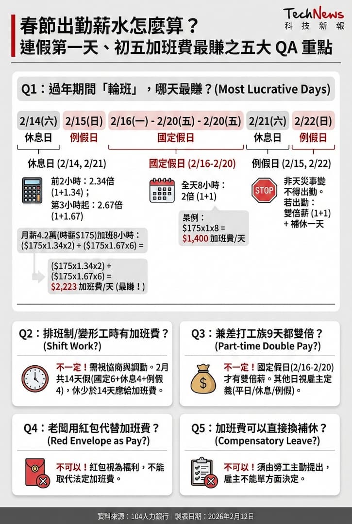 農曆春節即將來臨,2/14(六)連假第一天、2/21(六)初五加班能賺最多加班費,且老闆不能用紅包代替加班費,連續 9 天連假的加班薪水怎麼算?排班制、時薪制也領得到加班費嗎?104 人力銀行整理春節假期常見加班情境的五大 QA,幫助工作者掌握個人權益。