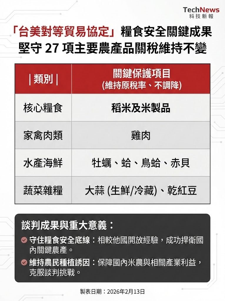 最後,在「糧食安全」原則下,「台美對等貿易協定」已確保 27 項主要農產品不降稅,包括「稻米及米製品、雞肉、牡蠣、蛤、鳥蛤、赤貝、大蒜(生鮮或冷藏)、乾紅豆」等攸關糧食安全的項目不調降進口關稅、維持原稅率。相較於日本開放美國稻米進口,我國談判團隊可以守住糧食安全,進而維持國內米農持續種植稻米的誘因是非常不容易的,守住國內糧食安全與國內農民利益應是本次台美對等關稅談判最大的挑戰,但最後也得到較其他貿易對手國更好的成果。這也說明,糧食安全已不是口號,而是具體的行動。