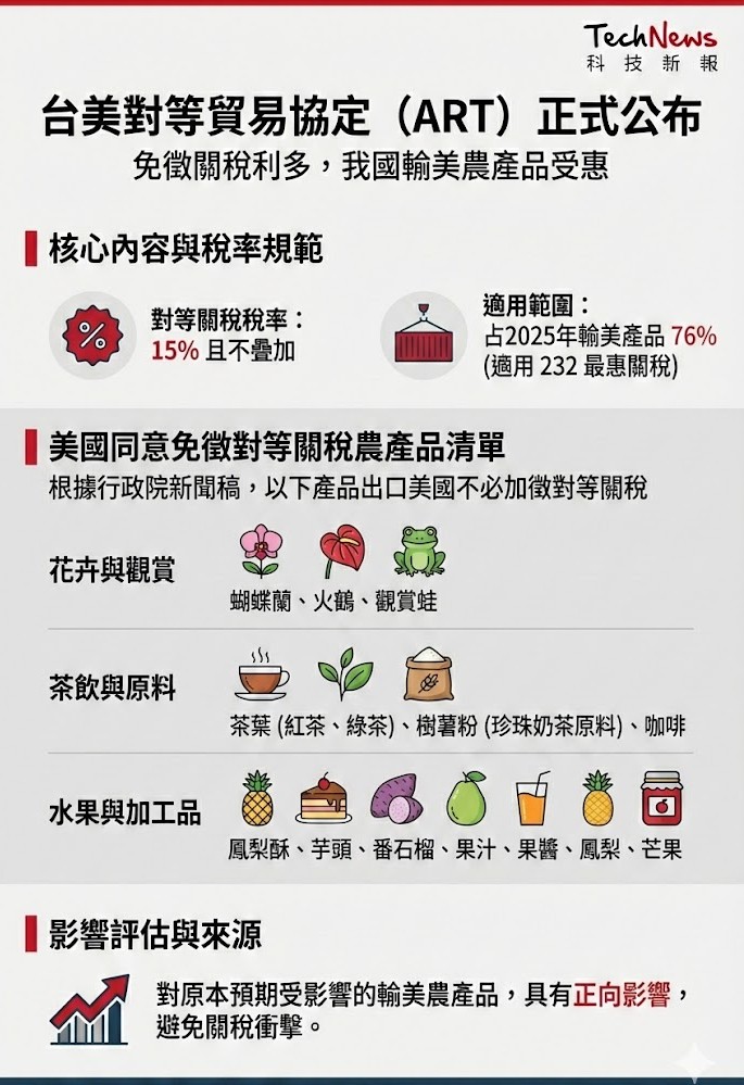 「台美對等貿易協定(Agreement on Reciprocal Trade,簡稱 ART)」內容已正式公布,除了「15% 且不疊加」的稅率以及占我國 2025 年輸美產品 76% 的適用 232 最惠關稅的產品外,根據行政院的新聞稿指出,美國也同意給予「我出口主力產品如蝴蝶蘭、茶葉(紅茶、綠茶)、樹薯粉(製作珍珠奶茶中珍珠的原料),以及咖啡、火鶴、鳳梨酥、芋頭、番石榴、果汁、果醬、鳳梨、芒果、觀賞蛙等農產品,出口美國都不必加徵對等關稅」,這對原本預期會受對等關稅影響的輸美農產品而言,具有正向的影響。