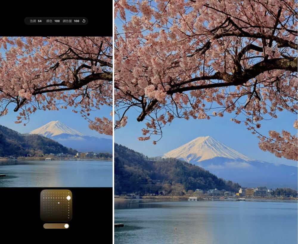 他建議,在春季拍攝櫻花的時候,推薦使用「金色」攝影風格,一樣可將調色盤往右上調整,提升明亮度與鮮艷度,讓花朵色彩更加飽滿。