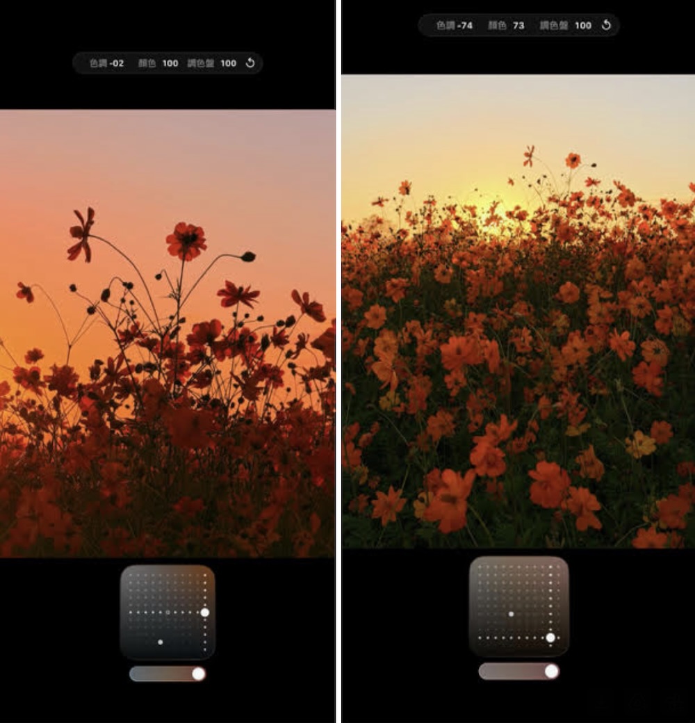 捕捉夕陽時刻,或拍攝風景題材時,建議將攝影風格這定為「玫瑰金色」。可將調色盤向右下方向調整,可以獲得高對比、飽和度更高的照片,增加夕陽黃昏的暖色調表現,讓畫面呈現更有層次的光影與氛圍感。如果想讓天空的顏色呈現夢幻般的漸層黃昏色調,推薦使用「溫馨模式」,並將調色盤調整至中間偏右的位置,營造柔和且富有層次的夕陽氛圍。