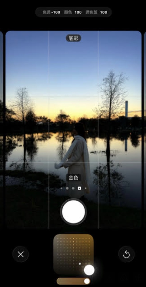 女友與夕陽的結合絕對是情人節必備的「拍攝定番」。紀映光建議,當在拍攝夕陽與人像時,先將攝影風格選擇「金色」,調色盤調整方式往右下調整。