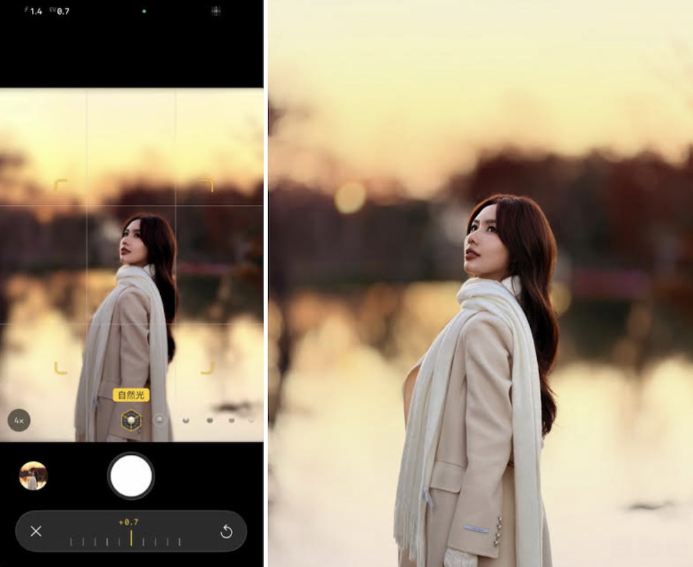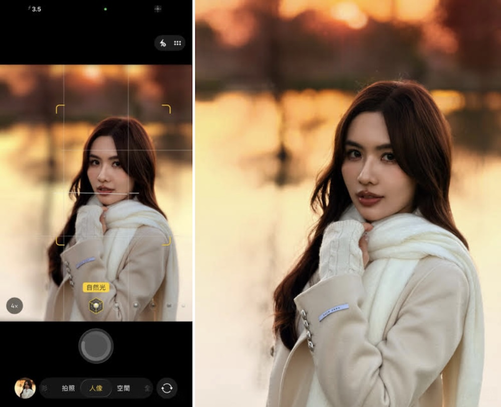 接著開啟「人像模式」並使用 4 倍鏡頭,將光圈設定為 f/3.5 ,按下快門即可拍出超美的夕陽人像照。
