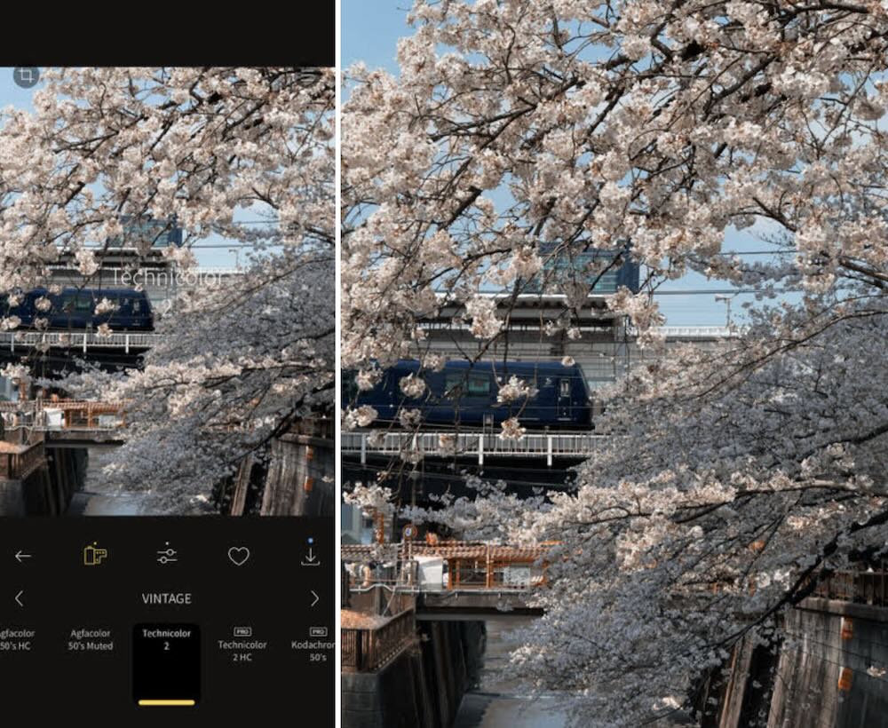 拍攝日本題材與櫻花季時,特別推薦使用 Technicolor 2 色調。這款色調能強化粉色與整體層次,同時保留與背景的細節,讓畫面色彩更鮮明卻不失質感,呈現更具風格辨識度的影像效果。