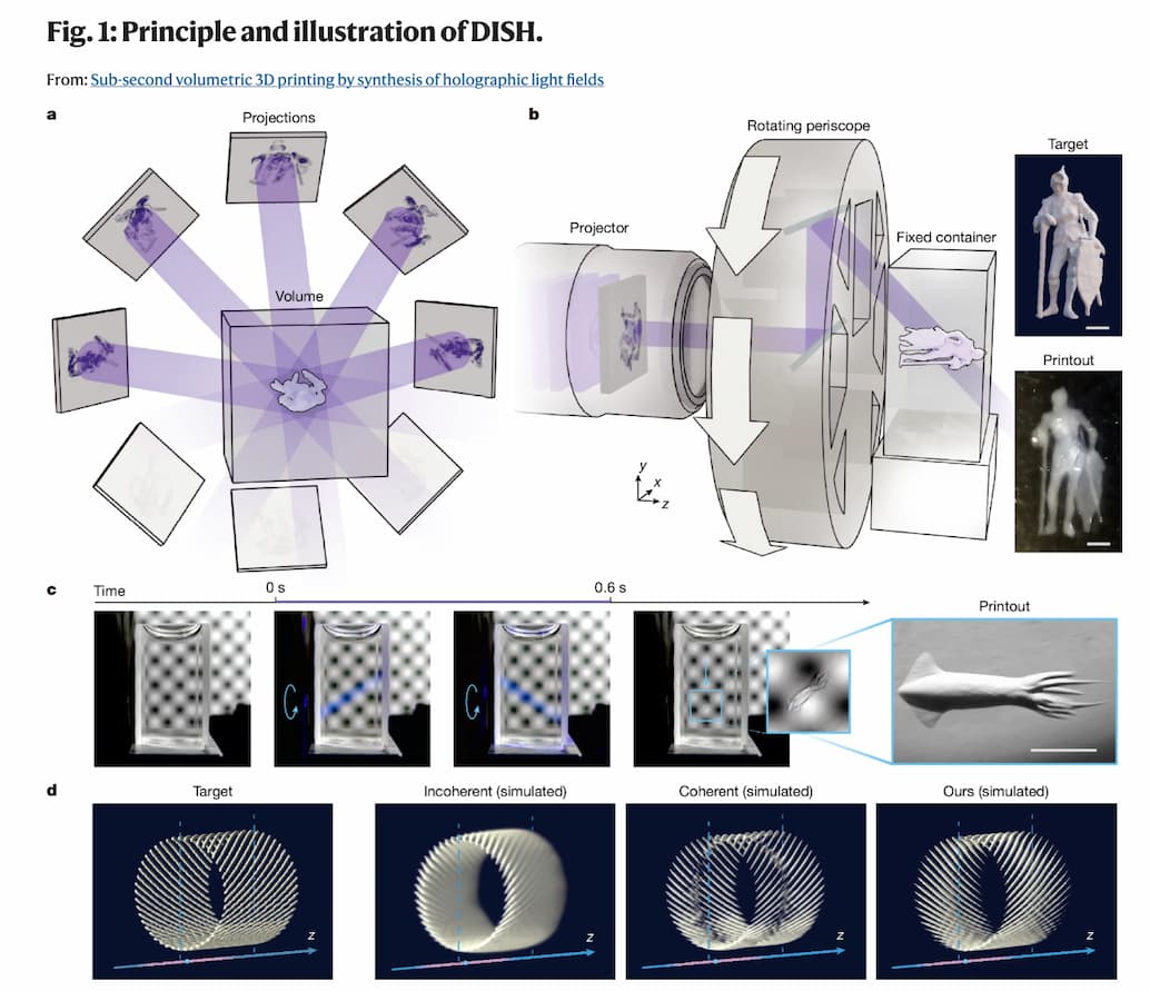 傳統的體積增材製造技術是讓物體放置在基座上旋轉 360 度,同時投射圖案化光源,使高黏度樹脂固化成固體形狀;DISH 技術則在此原理上進行改良與延伸,實現更精確且多角度的光控制,這也是計算光學對這項突破如此重要的原因。