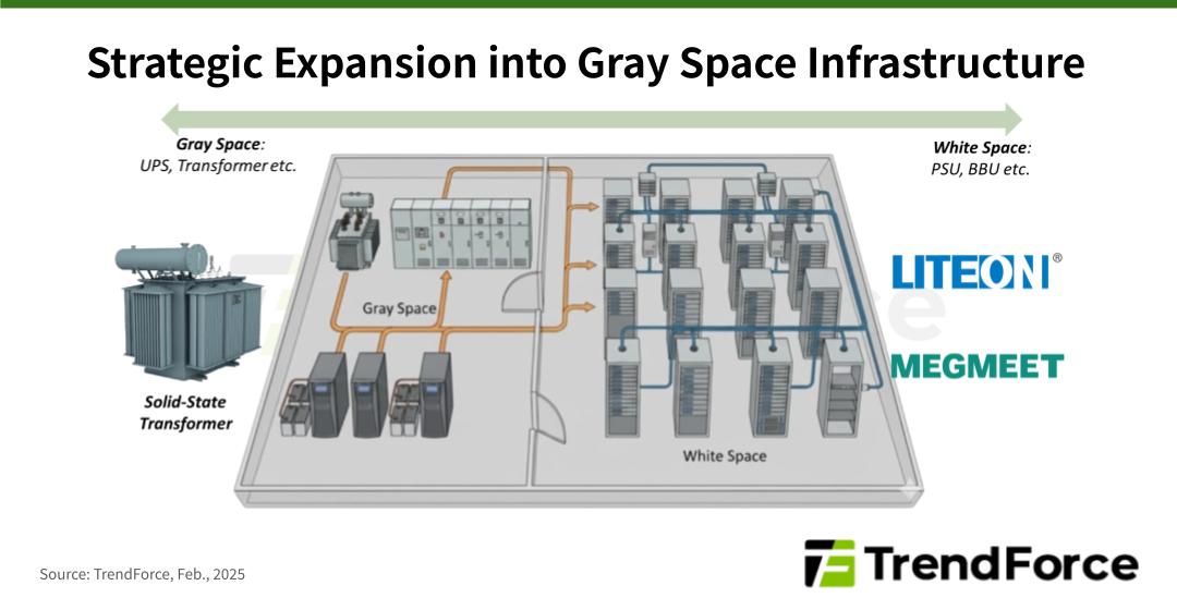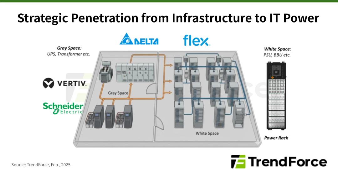 反觀長期盤據資料中心灰區市場龍頭的 Vertiv 與 Schneider Electric,面對 AI 算力推升功率密度,亦不甘固守傳統設施領域。兩者正積極採取「由外向內」的滲透策略,將產品防線從傳統的大型 UPS 與配電系統,強勢延伸至白區核心。眼見 Rack Level 成為新一代電力調度樞紐,雙方皆加速布局 Power Rack 解決方案。然而,受限於過去在 PSU 與 BBU 等產品缺乏長期設計經驗,兩者在此領域仍屬新進入者 (New Entrants)。為補足技術拼圖並快速切入市場,也傳出其有意尋求與既有廠商進行系統整合,試圖透過「借力使力」的模式克服學習曲線,以最短時間縮短研發週期。