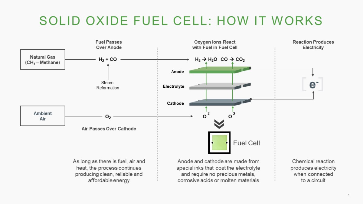 其運作方式可想像為一座在高溫下(大約溫度在 500 度–1000 度之間)持續運轉的微型化學發電系統:燃料由陽極一側進入並先轉化為氫氣;空氣中的氧氣則由陰極進入,在固態電解質(固態金屬陶瓷)中形成可移動的氧離子。當氧離子穿越電解質與氫氣反應時,會生成水與二氧化碳,同時釋放電子形成電流。