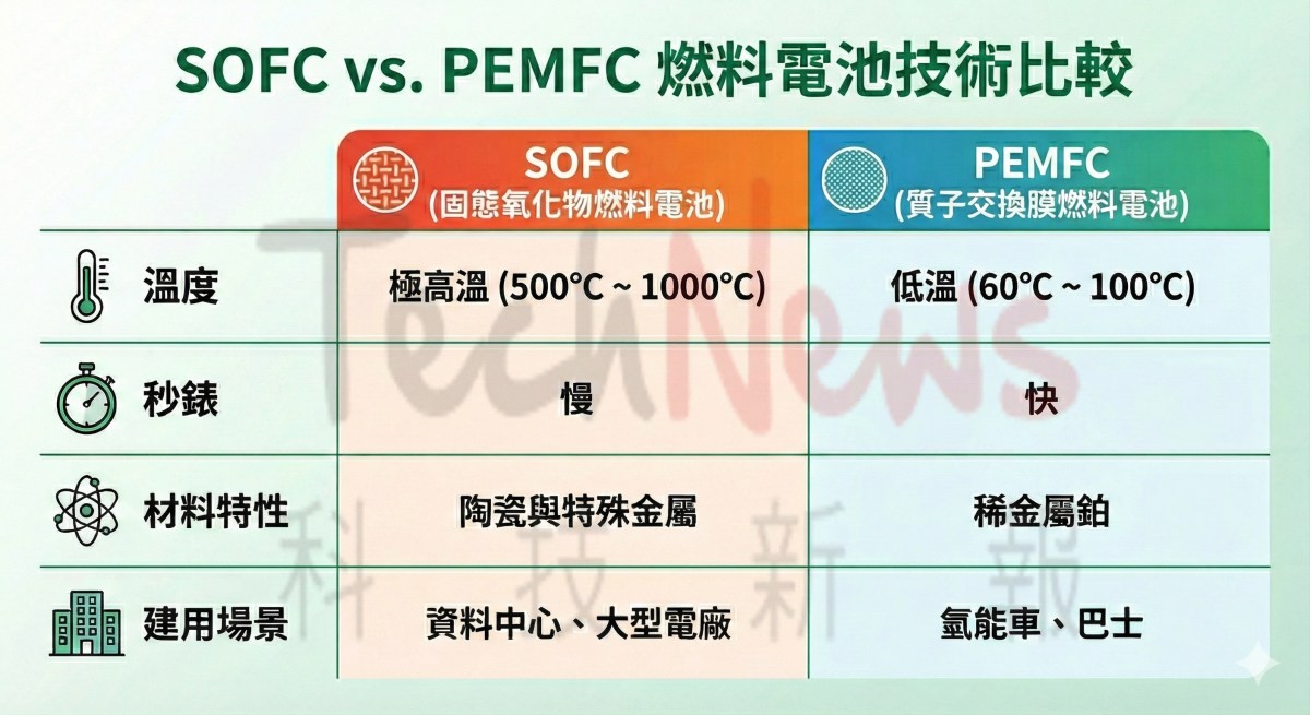 雖然 SOFC 與車用常見的 PEMFC 同屬氫能燃料電池,但應用場景截然不同。PEMFC 以低溫(100度以下)運作、啟動快速為特點,適合需要頻繁啟停的交通工具;相較之下,SOFC 採高溫運作,啟動時間較長,但具備極高的發電效率。