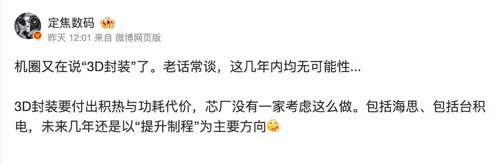 中國微博帳號「定焦數碼」表示,雖然業界傳聞台積電與華為可能轉向此封裝技術,但目前仍會先專注於改進製程。