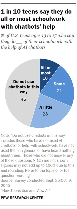 雖然並非所有青少年都在學校作業中使用 AI,但約 45% 的青少年表示不使用這項技術;仍有 10% 承認自己在大多數或全部學校作業中依賴 AI。約四分之一的青少年認為這項技術對學校作業「非常」或「極其」有幫助,另外約四分之一則認為「有些」幫助。