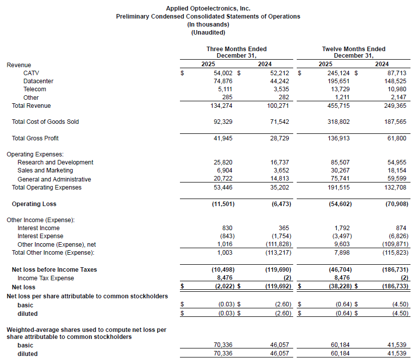 Investor’s Business Daily、MarketBeat報導,Applied Optoelectronics於2月26日美股盤後公布第四季(2025年10-12月)財報:營收較年增34%至1.343億美元,擊敗分析師預估值1.323億美元;經調整的非一般公認會計原則(non-GAAP)每股虧損為0.01美元,優於去年同期的每股虧損0.02美元及分析師原先預估的每股虧損0.11美元。