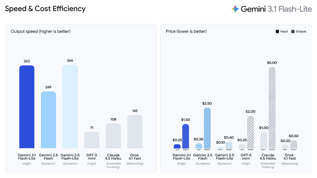 ▲ Gemini 3.1 Flash-Lite 在速度和品質方面優於 Gemini 2.5 Flash。