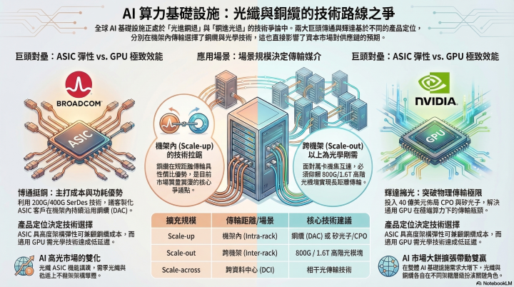 反觀博通主要為客戶提供高度客製化的 ASIC 算力解決方案。因為具備極高的 ASIC 架構彈性即便在架構設計中,短距離傳輸繼續沿用傳統的銅線技術,依然能夠精準滿足特定客戶對於運算效能的需求,同時兼顧嚴格的成本考量。儘管博通成功證明了銅線在 Scale-up(機架內)架構下依然具備強大的生命力與競爭力,但業界專家提醒,評估 AI 基礎設施不能僅侷限於單一機架內,必須將格局放大至整體網路架構。