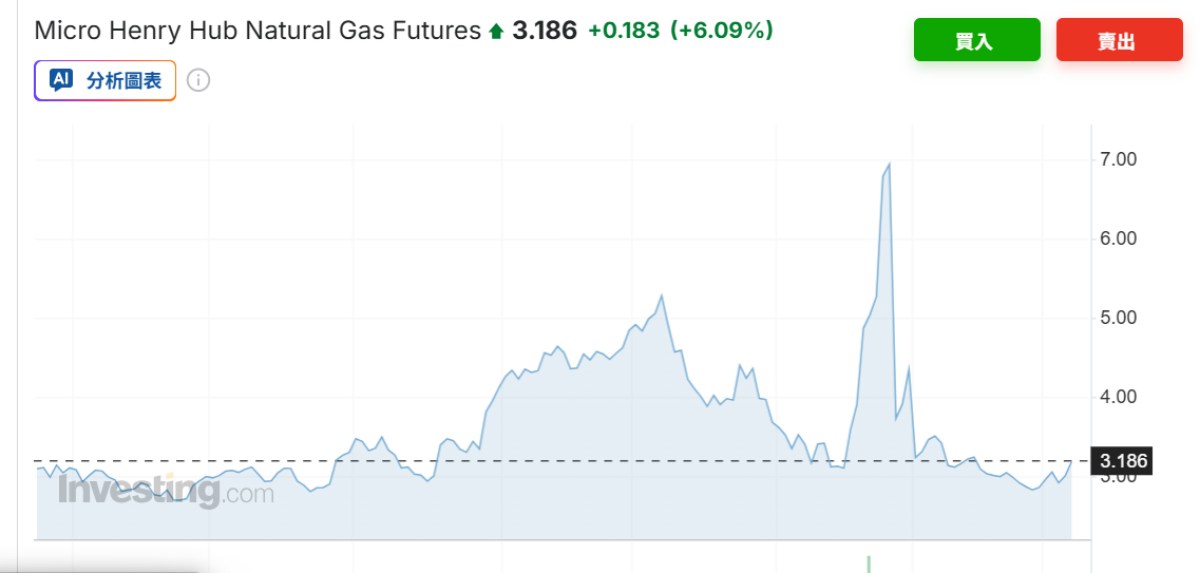 天然氣方面,美國天然氣 Micro Henry Hub 目前約落在 3.18 美元/MMBtu 左右。雖然較年初寒流期間的高點回落,但近期在地緣政治風險推升下,價格已連續兩日反彈。