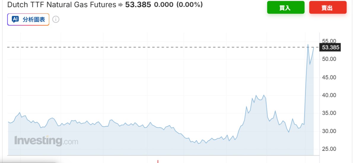 歐洲天然氣基準荷蘭 Title Transfer Facility(TTF)則因市場擔憂卡達供應可能受影響,加上歐洲正進入夏季補庫階段,站上 53 歐元/MWh。