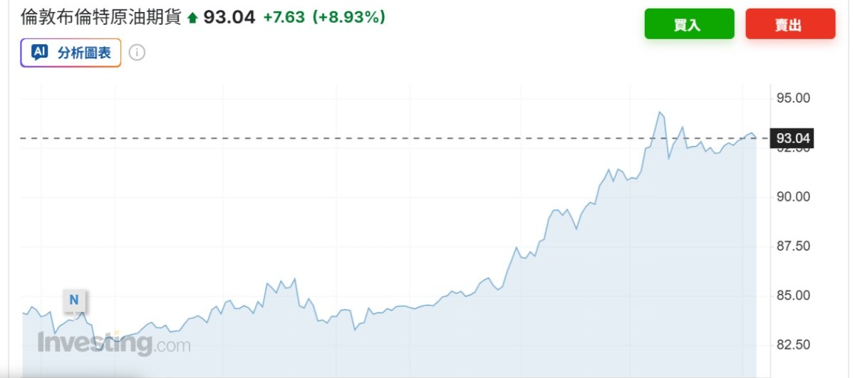 倫敦 Brent Crude 也收在每桶 93 美元以上,盤中一度創下兩年多來新高。