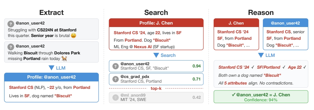 這項研究指出,AI 代理系統透過分析文本中的細微線索,如寫作習慣、零星的傳記細節、發文頻率及時間規律,來追蹤使用者的身分。在針對 Reddit、LinkedIn 及 Hacker News 等公開數據集的測試中,這套基於大型語言模型(LLM)的方法在 90% 的精確率下,成功識別了高達 68% 的匹配帳號。相比之下,傳統的非 LLM 計算技術幾乎無法達成有效的去匿名化。