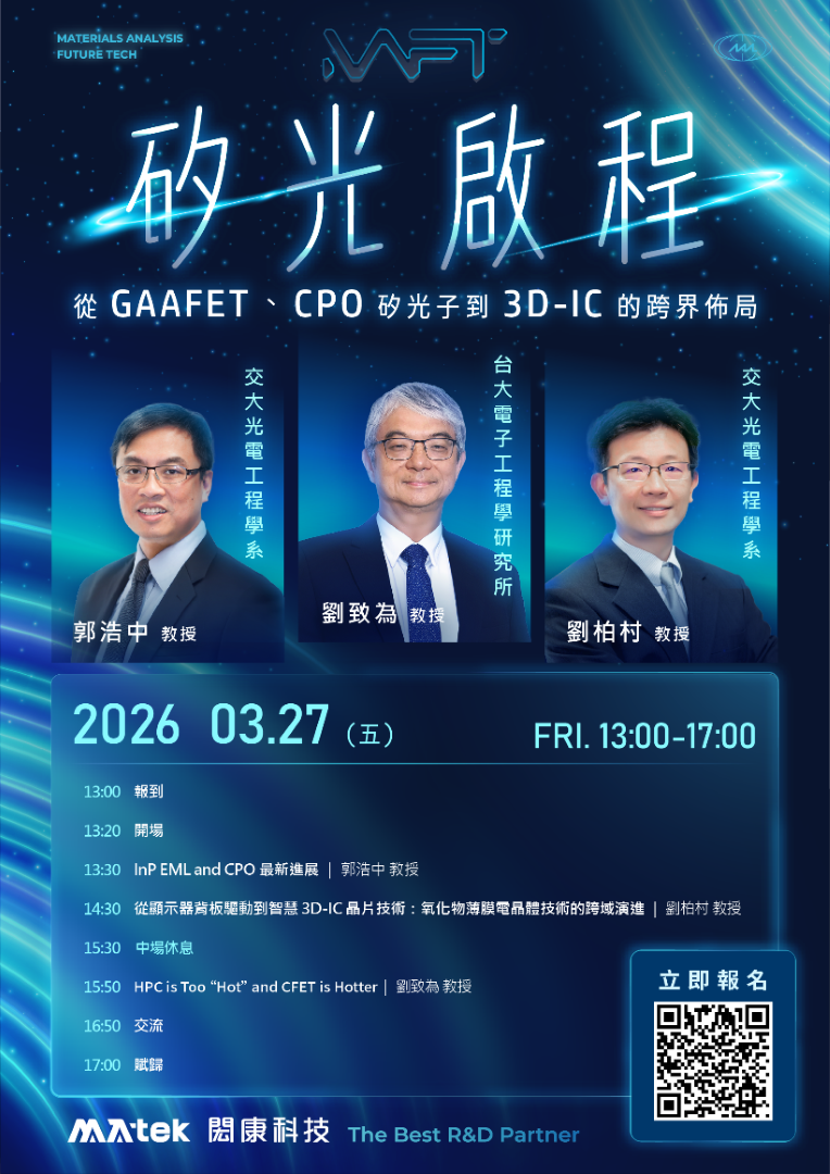 為協助產業掌握關鍵技術演進方向,閎康科技將於 2026 年 3 月 27 日(五)下午 1 時至 5 時,於新竹矽導廠(新竹市力行一路 1 號 1A3)舉辦「MAFT 研討會:矽光啟程—從 GAAFET、CPO 矽光子到 3D-IC 的跨界佈局」,邀請國內光電與半導體領域重量級學者,從元件物理、製程整合到可靠度與分析觀點,深入探討 AI 時代下的關鍵工程挑戰與技術路徑。