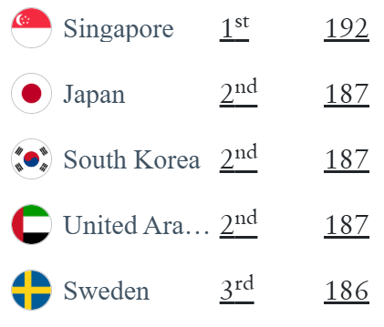 最新排名,新加坡再度蟬聯榜首,持星國護照者可免簽前往192個旅行目的地。日本、韓國、阿拉伯聯合大公國並列第二,可免簽進入187個國家和地區。瑞典排名第三,可免簽進入186個旅行目的地。