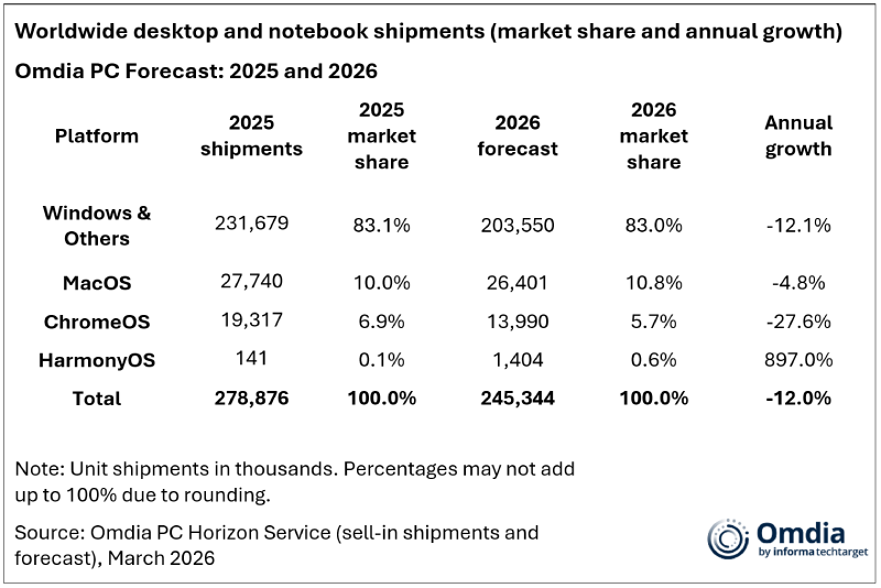 綜合中媒報導,根據 Omdia 發布,在 2026 年第一季記憶體價格上漲 60%、全年後續漲幅相對溫和的預設下,今年全球 PC 出貨量將年減 12%,降至 2.45 億台;其中,桌上型電腦預計下滑 10% 至 5,320 萬台、筆記型電腦下滑1 2% 至 1.92 億台。