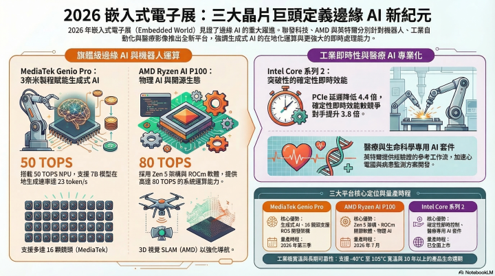 隨著工廠自動化、行動機器人中的物理 AI(Physical AI)以及各類 AI 驅動的邊緣應用呈現爆炸性成長,全球邊緣運算市場正迎來前所未有的技術變革。在德國紐倫堡盛大開幕的「2026 德國嵌入式電子與工業電腦應用展(Embedded World 2026)」上,全球三大晶片設計巨擘──聯發科技(MediaTek)、超微半導體(AMD)與英特爾(Intel)不約而同地發表了旗下最新一代的邊緣 AI 運算平台,並全面劍指次世代工業型機器人、商用無人機以及智慧醫療等邊緣 AI 藍海市場。