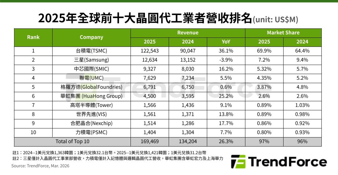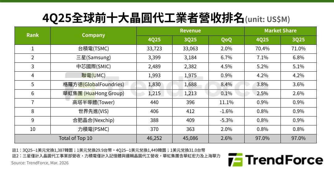 三星(Samsung)Foundry(排除System LSI)2025年第四季因2nm新品出貨貢獻營收,且自家HBM4使用的logic die晶圓亦開始產出,淡化整體產能利用率略降的不利因素,營收季增6.7%,近34億美元,不僅正式轉虧為盈,市占也從6.8%微幅升至7.1%,居第二名。