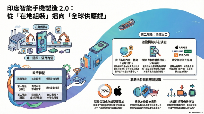 隨著第一階段任務達標,政策制定者正將戰略重點轉向具有更高附加價值的產業環節,以此作為超越 「簡單代工組裝」 的下一階段核心發展戰略。與即將結束的初步計畫不同,新的獎勵計畫明確地將各項優惠政策與設備的 「海外出口」 和 「在地化程度」 直接綁定,開始大力獎勵那些成功將設備出口至海外市場的製造商。透過將旗艦產品的生產連結獎勵計畫與海外出貨量結合,印度政府期望在各大製造商為了規避地緣政治風險而重新調整生產佈局的關鍵時刻,藉此將印度更深層次地融入全球供應鏈體系之中。