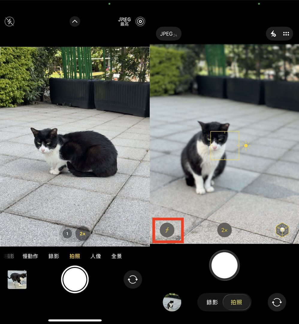 ▲ 鏡頭在對準貓咪時,iPhone 17e 的視窗會跳出「f」符號,顯示拍攝貓咪時也可製造出景深,讓主體更為突出。