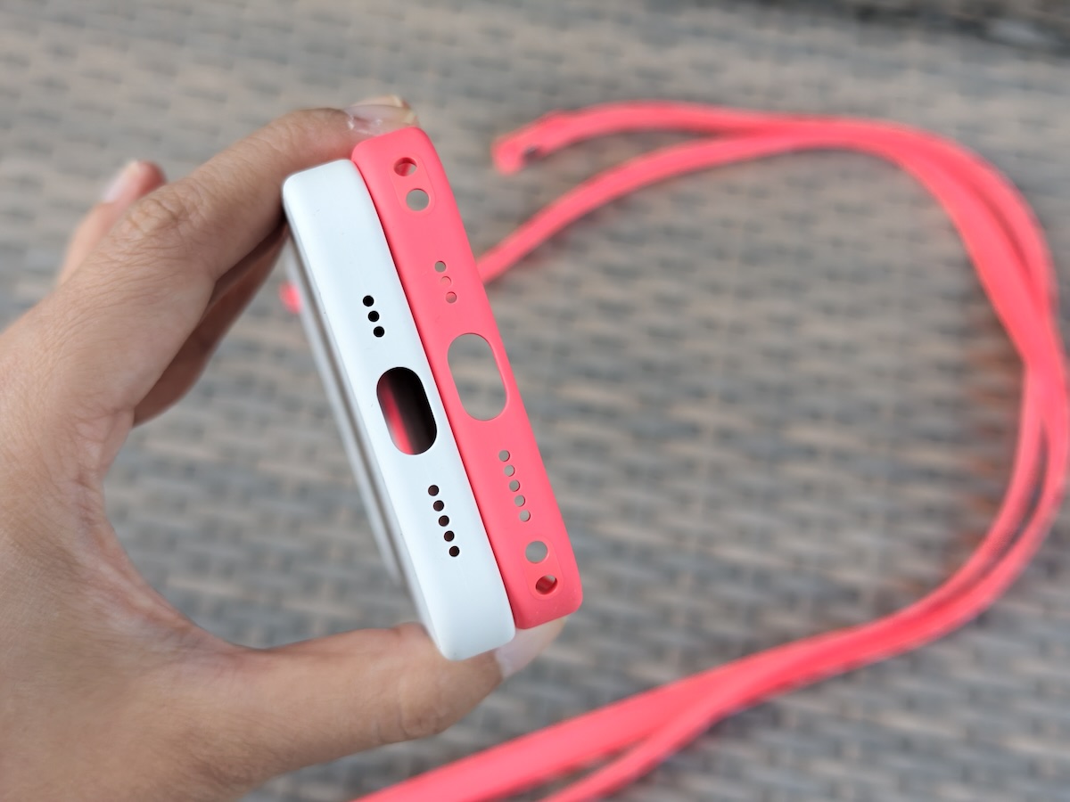 ▲ iPhone 17e 護殼(亮芭樂紅色)下方左右兩側都預留了可掛上斜背掛繩的孔洞,iPhone 16e 護殼(白色)則沒有。