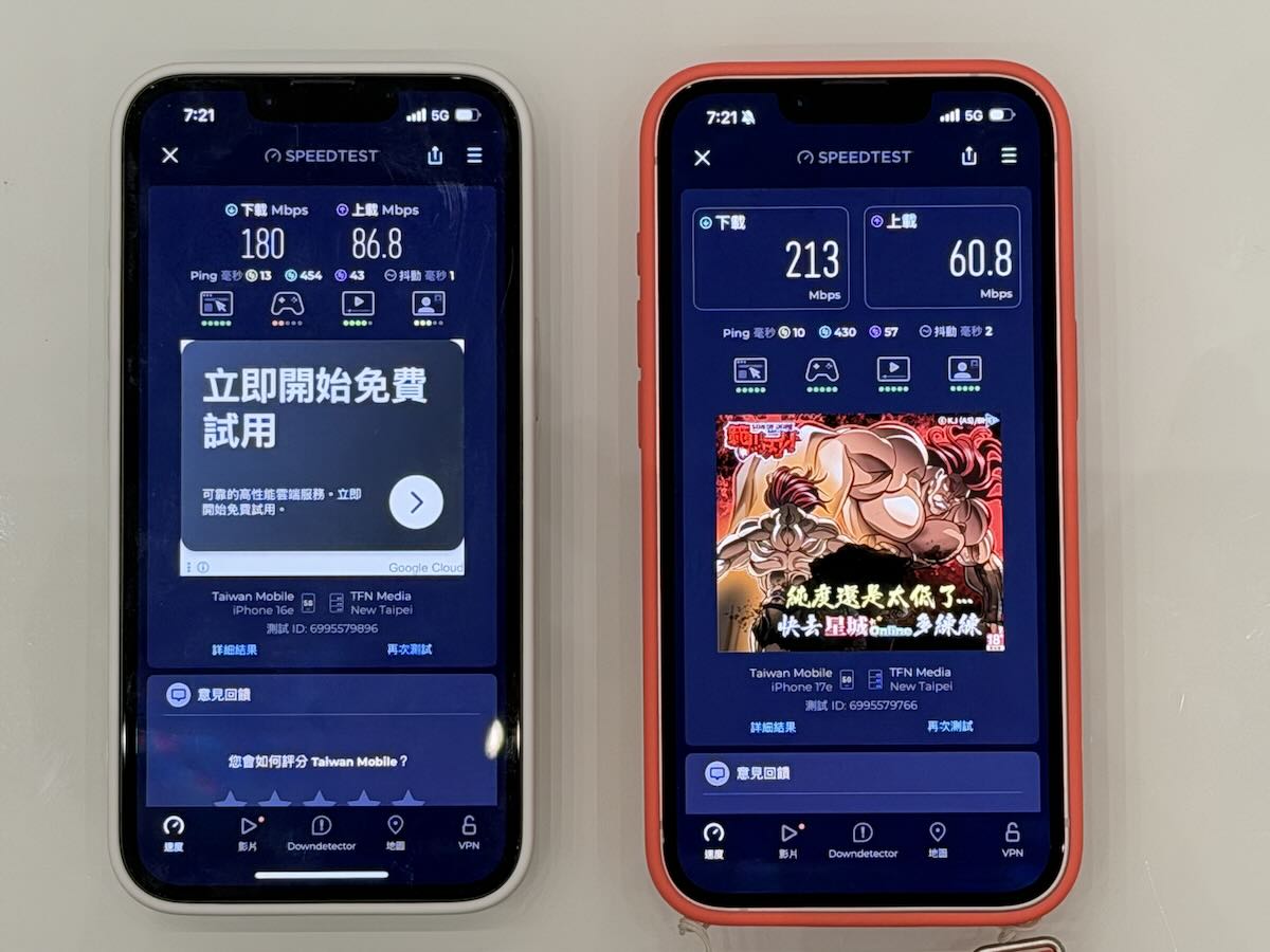 記者另在新北土城某處室內環境進行測試,iPhone 17e 的下載速度為 213Mbps、上傳速度為 60.8Mbps;iPhone 16e 的下載速度則為 180Mbps、上傳速度為 86.8Mbps。在此測試場景下,iPhone 17e 的下載速度約提升 18%,但上傳速度則略低於前代。