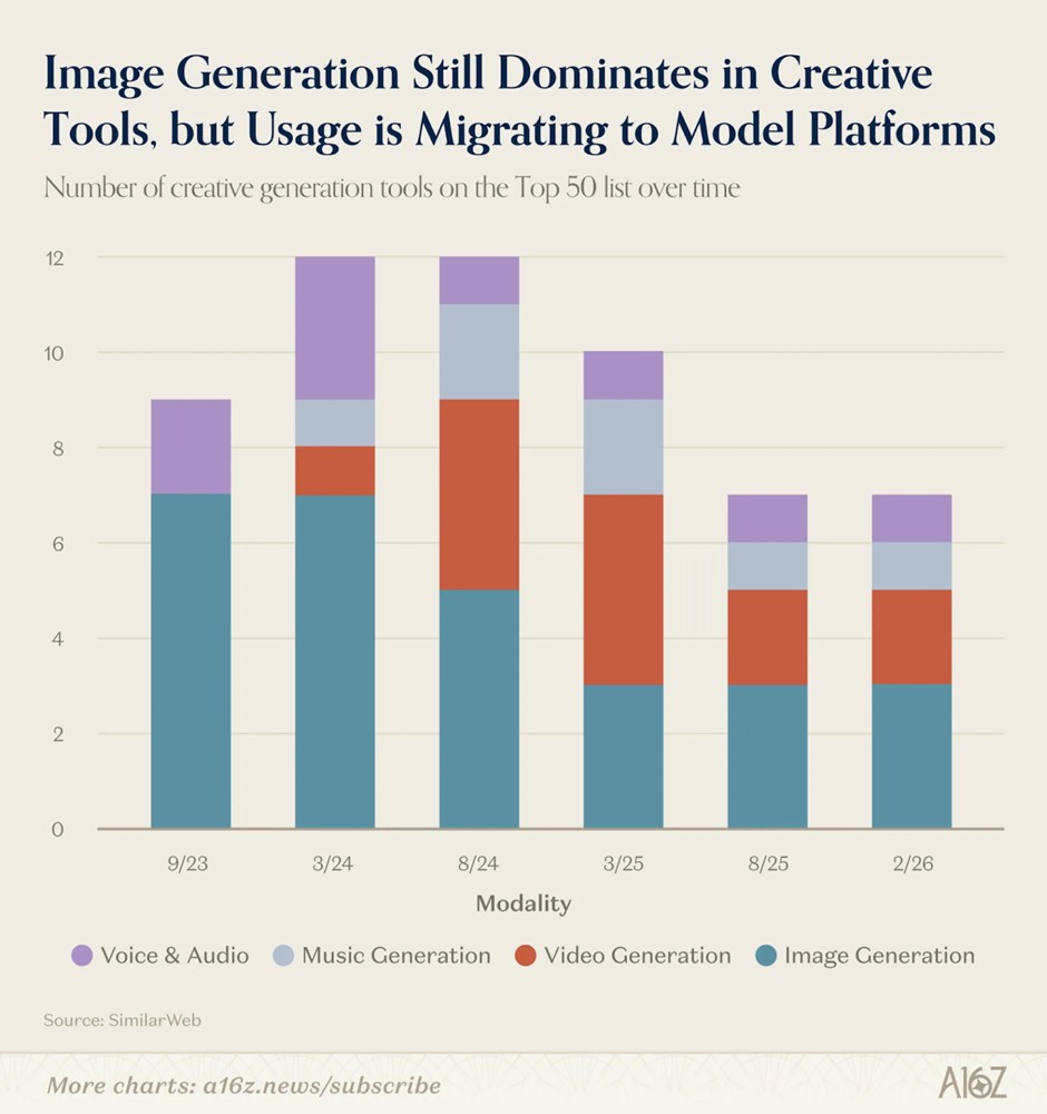 這可能是意料之外的轉變。2023年a16z首次發布百大生成式生成式AI應用(AI apps)榜單時,前9大創意工具中,有7款是純圖像生成工具。