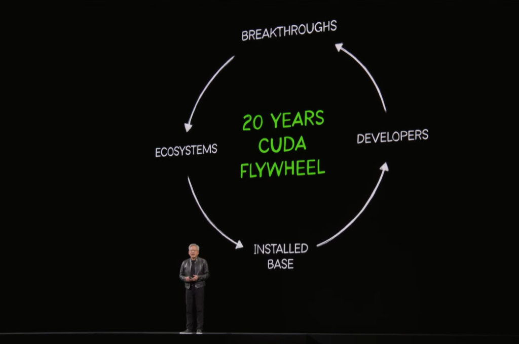 這個龐大的安裝基數正是驅動輝達「飛輪(flywheel)」加速運轉的核心動力。龐大的基數吸引了開發者,開發者進而創造出能達成突破(如深度學習)的新演算法;這些突破進一步開拓新市場、建立新生態系,並吸引更多公司加入,進而再次擴大安裝基數。黃仁勳透露,輝達函式庫的下載量正以史無前例的速度呈現指數型成長,這座飛輪正在以前所未有的速度加速轉動。