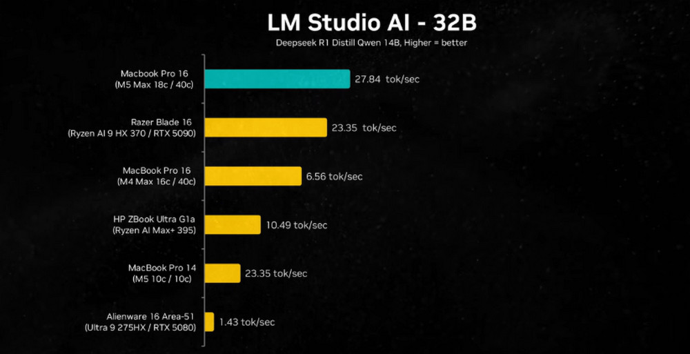 而且在AI相關的需求持續高漲下,MacBook的整合式記憶體設計(Unified Memory)正在逐漸展現大容量記憶體空間的優勢。因為是CPU和GPU共享記憶體,等於是GPU最大也可以擁有128G的專屬記憶體,有利用塞進更大的AI模型,這點也從媒體評測的結果可以看到:在32B以上較大的模型上M5 Max的效能甚至贏過了筆電GPU之王RTX 5090。