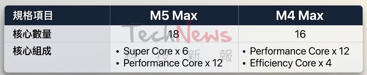 新的M5家族旗艦M5 Max相比上一代多增加了兩個核心,並首此導入超大核(Super Core),等於是M5 Max上不再有E核(Efficient Core),理論上效能應該會有顯著成長。然而經媒體測試後發現M5 Max的多核效能幾乎和上一代的M4 Max一樣。這樣的狀況在隔壁陣營的英特爾和AMD已經見怪不怪,但在蘋果電腦上還是第一次看到。