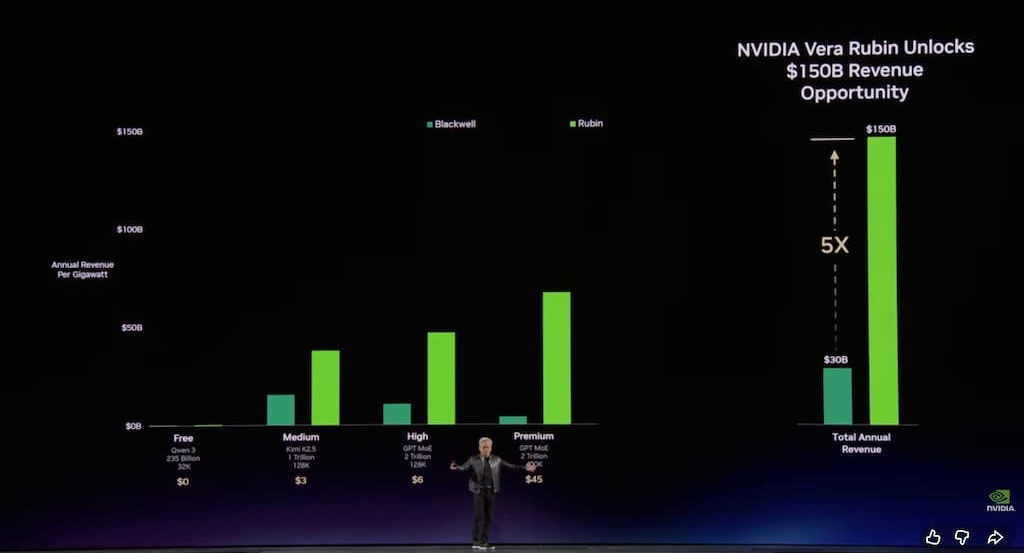 從客戶角度來看,如果將所有資源分配,其中 25% 用於免費層,25% 用於中等層,25% 用於高層,25% 用於高級層,當資料中心只有一吉瓦時,就可以決定如何分配。也因此,隨著新產品不斷迭代,相比 Blackwell,Vera Rubin 能創造 5 倍收入。