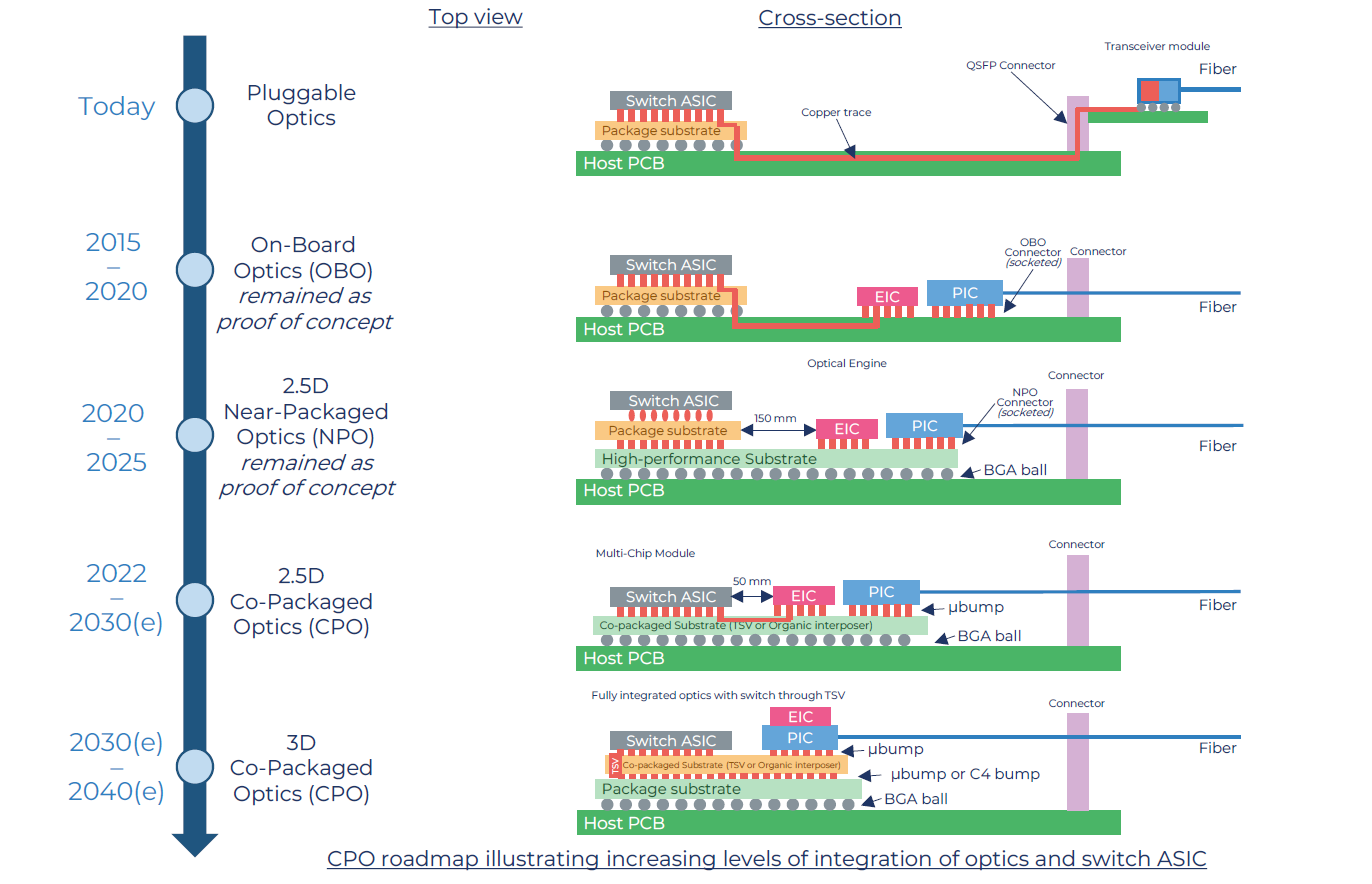 ▲ 矽光子概念發展多年,但市場預期結合 2.5D、3D 封裝,ASIC 運算晶片與光學引擎(PIC+EIC)共同封裝的 CPO 技術,要到 2030 年左右才有望真正普及。(Source:Yole)