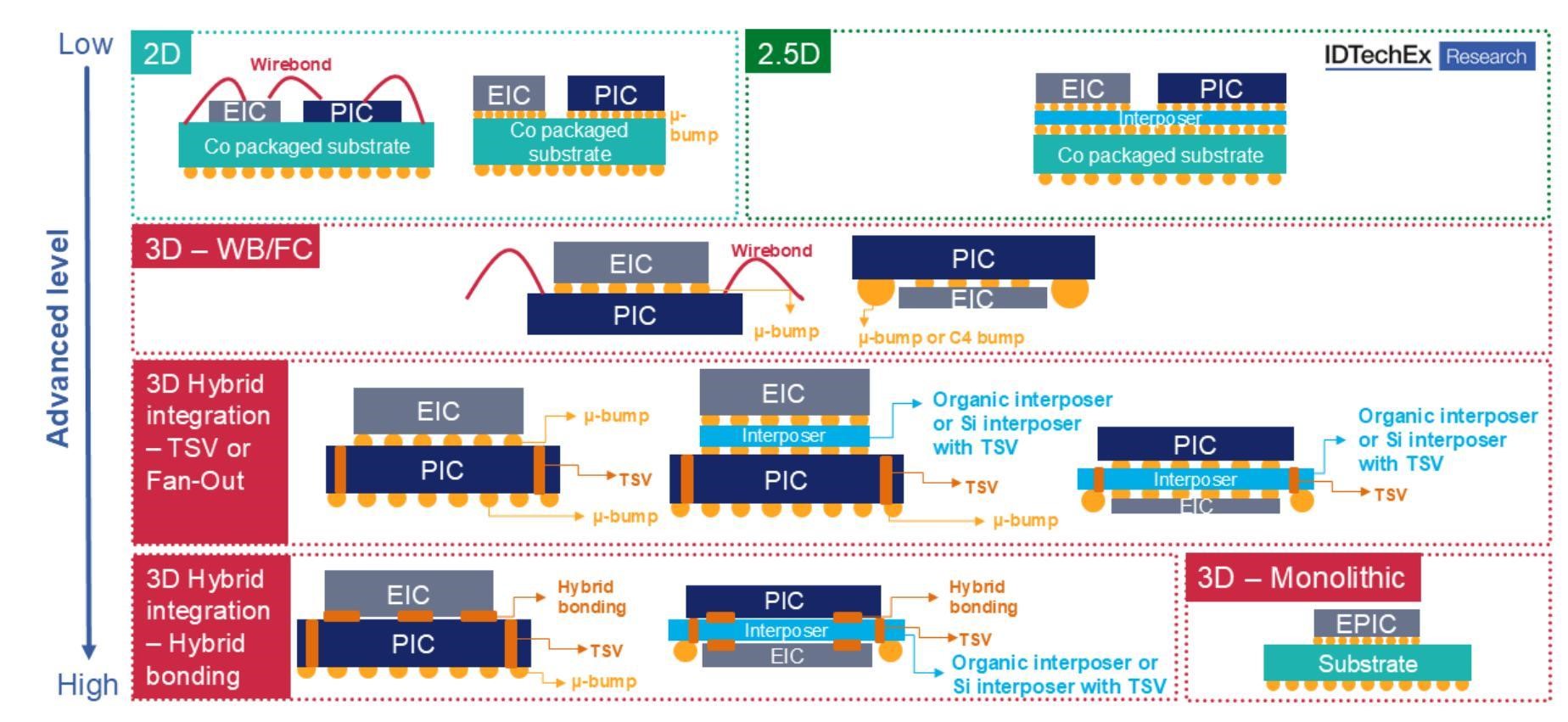▲ 光學引擎封裝技術圖,從 2D 封裝到 2.5D、3D 封裝 TSV與混合鍵合等封裝技術進展,使光子晶片(PIC)與電子晶片(EIC)得以逐步縮短互連距離。(Source:IDTechEx)