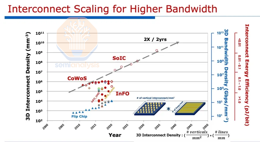▲ SoIC 相較 CoWoS、InFO 等封裝技術,晶片互連密度更高,在高頻寬、低功耗擁有更佳的優勢。(Source:semianalysis)